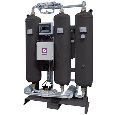 They are an optimal fit for compressed air applications where oil-free air is a necessity (meeting oil class 0/1 requirements as per ISO 8573-1). The dryers feature a two-column design, where one column absorbs moisture under pressure while the other regenerates with pre-dried compressed air. The dryer components comprise an upper and lower control block, a digital display controller, and two adsorbent-filled columns.